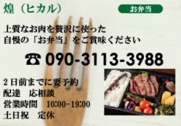 煌(ヒカル) 2020.12.24 2020.09.25 煌(ヒカル) ◆ご注文 2日前までに要予約 ◆ご注文先 090-3113-3988 ◆営業時間 10:00 ~ 19:00 ◆定休日 土曜・日曜・祝日
